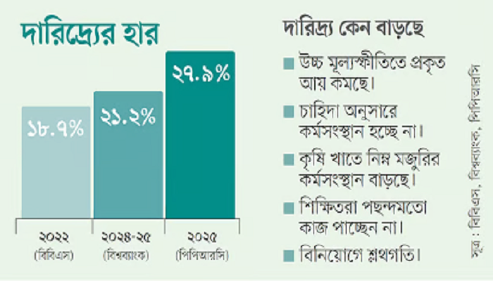 বিবিএসের ২০২২ সালের জরিপে দারিদ্র্যের হার ছিল ১৮.৭ শতাংশ। এরপর আর কোনো সরকারি জরিপ হয়নি। তবে বেসরকারি গবেষণা প্রতিষ্ঠান পিপিআরসির মে ২০২৫ সালের প্রতিবেদনে বর্তমানে দারিদ্র্যের হার প্রায় ২৮ শতাংশ। আরও ১৮ শতাংশ মানুষ যেকোনো সময় দারিদ্র্যের মধ্যে পড়ে যেতে পারেন। অর্থাৎ, তিন বছরে প্রতি ১০ জনে আরও ১ জন দরিদ্র হয়েছে।