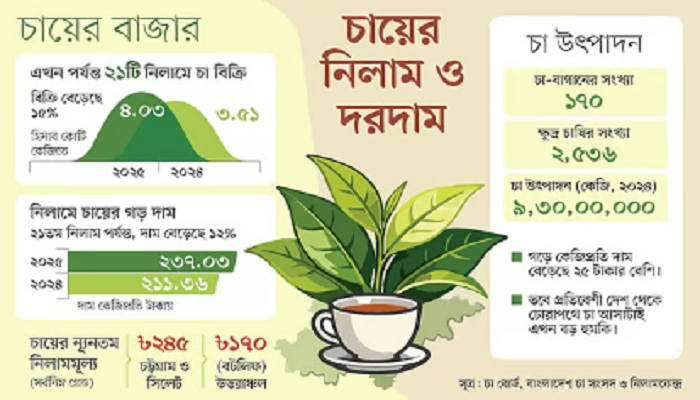 চট্টগ্রাম চা নিলামকেন্দ্রের তথ্য অনুযায়ী, চলতি মৌসুমের প্রথম ২১টি নিলামে বিক্রি হয়েছে ৪ কোটি ৩ লাখ কেজি চা। গত মৌসুমের একই সময়ে বিক্রি হয়েছিল ৩ কোটি ৫১ লাখ কেজি—অর্থাৎ বিক্রি বেড়েছে ১৫ শতাংশ।