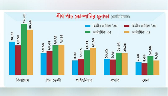 শীর্ষ পাঁচ কোম্পানির নিট মুনাফা মোট ১৩৮ কোটি ৭০ লাখ টাকা, যা মোট মুনাফার প্রায় ৪৪ শতাংশ। শীর্ষ দশ কোম্পানির নিট মুনাফা ১৮২ কোটি টাকা, মোটের সাড়ে ৫৭ শতাংশ। জানুয়ারি থেকে জুন পর্যন্ত রিলায়েন্স ইন্স্যুরেন্স সর্বাধিক ৫৬ কোটি ৬৮ লাখ টাকা মুনাফা করেছে, দ্বিতীয় স্থানে গ্রিন ডেল্টা ২৮ কোটি ২৫ লাখ, পাইওনিয়ার ২১ কোটি ৫০ লাখ, প্রগতি ১৮ কোটি ৩৭ লাখ, সেনা ১৩ কোটি ৮৮ লাখ এবং সিটি জেনারেল ১১ কোটি ১১ লাখ টাকা মুনাফা অর্জন করেছে।