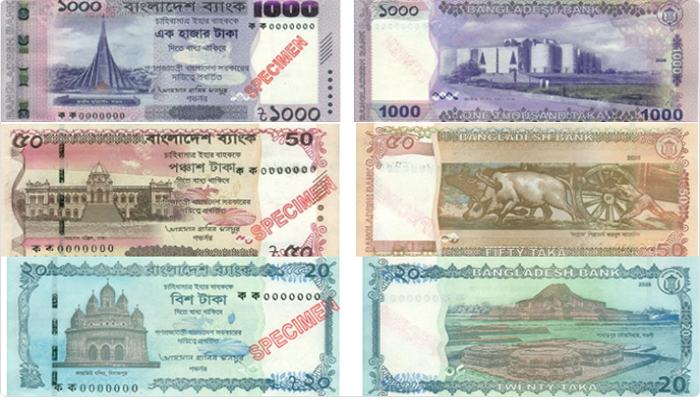 নতুন নোটগুলোর বিশেষ বৈশিষ্ট্য সম্পর্কে বলা হয়, ১০০০ টাকার নোটে জলছাপ হিসেবে ‘রয়েল বেঙ্গল টাইগার’র মুখ এবং ‘বাংলাদেশ ব্যাংকের মনোগ্রাম’ রয়েছে। পেছনের ডিজাইন হিসেবে রয়েছে জাতীয় স্মৃতিসৌধ ও জাতীয় সংসদ ভবনের মুদ্রিত ছবি। ৫০ টাকার নোটে রয়েছে আহসান মঞ্জিল এবং শিল্পাচার্য জয়নুল আবেদিনের বিখ্যাত চিত্রকর্ম ‘সংগ্রাম’। ২০ টাকার নোটে মুদ্রিত হয়েছে দিনাজপুরের কান্তজিউ মন্দির এবং নওগাঁর পাহাড়পুর বৌদ্ধবিহার।
